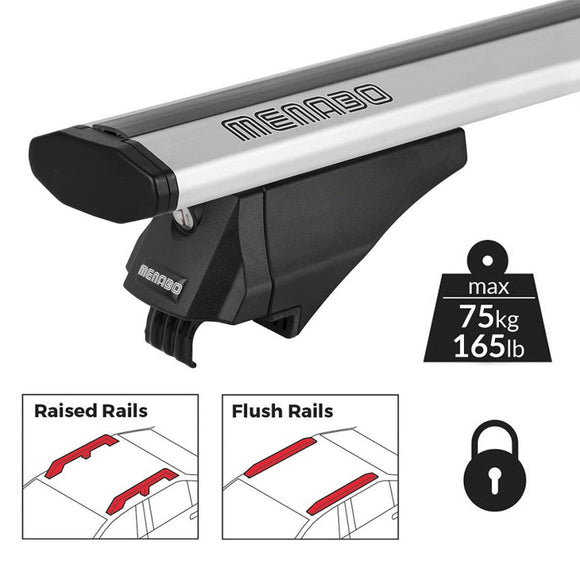 Le barre universali da tetto flush/raised rails Leopard Silver sono progettate con un profilo aerodinamico in alluminio, leggere ed eleganti. Hanno una cava predisposta al fissaggio di accessori tramite vite a T (T-System) e una protezione antifischio all'interno, mentre all'estremità è presente un morsetto che integra un sistema antifurto con una serratura a chiave di sicurezza. L’installazione delle barre è semplice e intuitiva e lo si fa in maniera del tutto autonoma, questo perché le barre universali da tetto sono vendute preassemblate e quindi pronte all'uso. Disponibili in due lunghezze a seconda della compatibilità dell’auto, le barre universali da tetto flush/raised rails Leopard Silver sono sicure, permettono di trasportare carichi fino ad un massimo di 75 kg e possono essere montate con railing di tipo flush e raised tradizionali.
